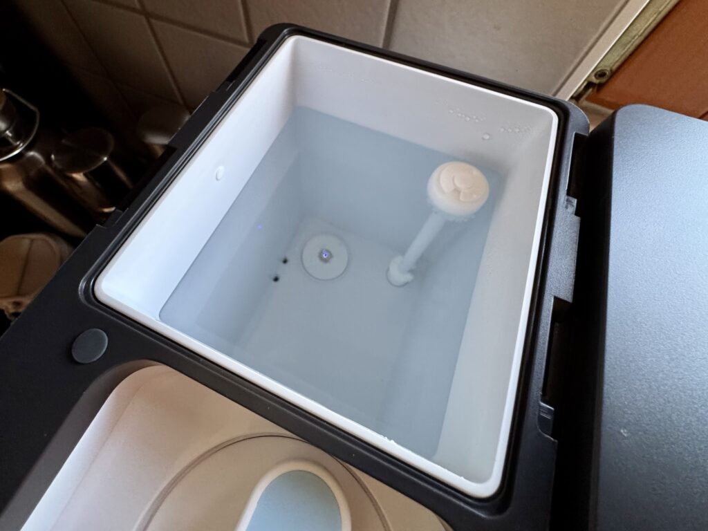 Wenn man den Schutzdeckel abnimmt, kann man hier das Innere des Vorrats-Behälters sehen, wo die UV Lampen ihren Dienst verrichten.