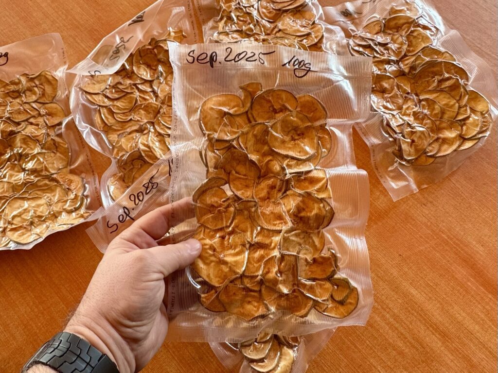 • Die Äpfel (links) werden richtig schön fest fast knusprig. Sie sind nah an dem typischen „Crunch“, den man von Chips erwartet.