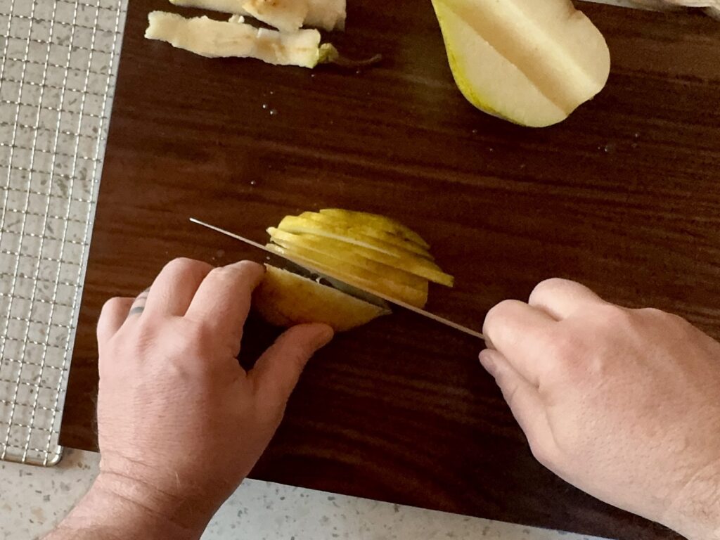 • Äpfel: Hier steche ich das Gehäuse komplett aus, damit diese typischen, sauberen Ringe entstehen. Dann halbiere ich sie und schneide sie längs in Scheiben. So entsteht ein halber Ring – das ist die schnellste und einfachste Methode.