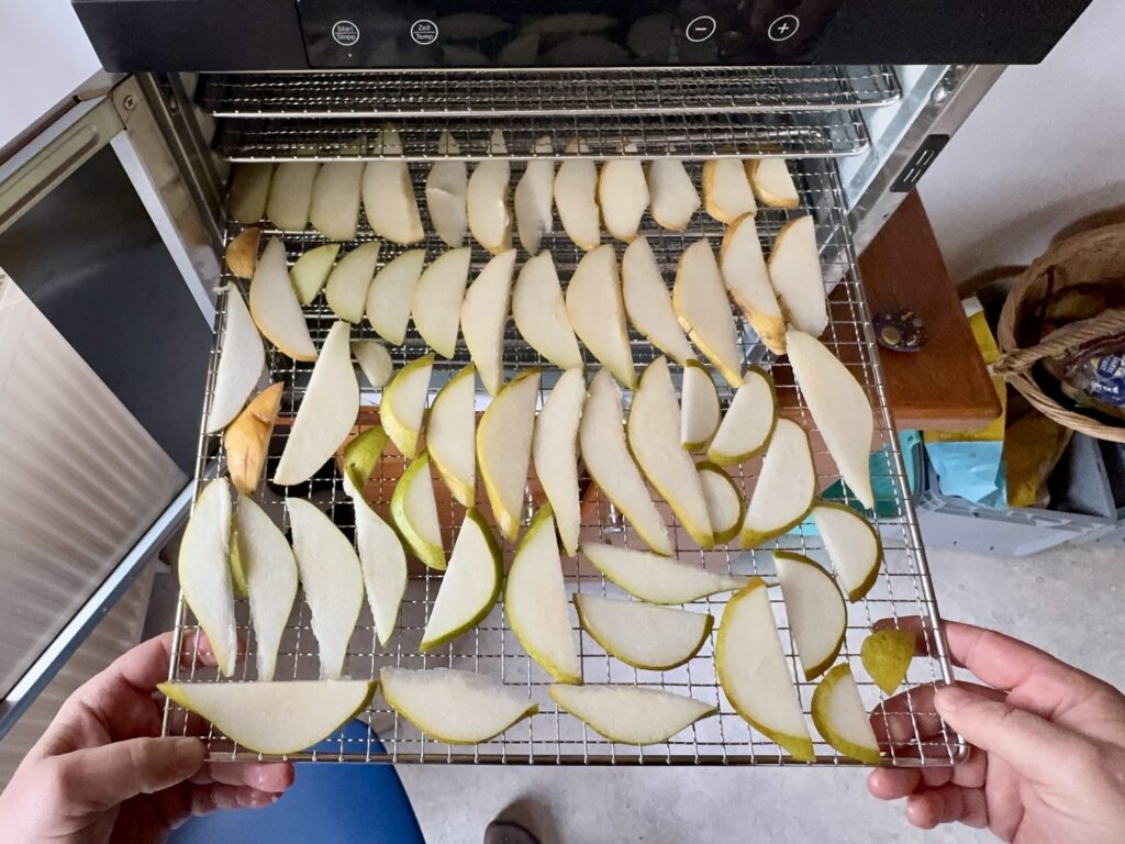• Die Birnen (rechts) hingegen bleiben durch ihren hohen Zuckeranteil etwas weicher und zäher. Sie werden nicht so kross wie die Äpfel, was beim Essen eine tolle Abwechslung ist.