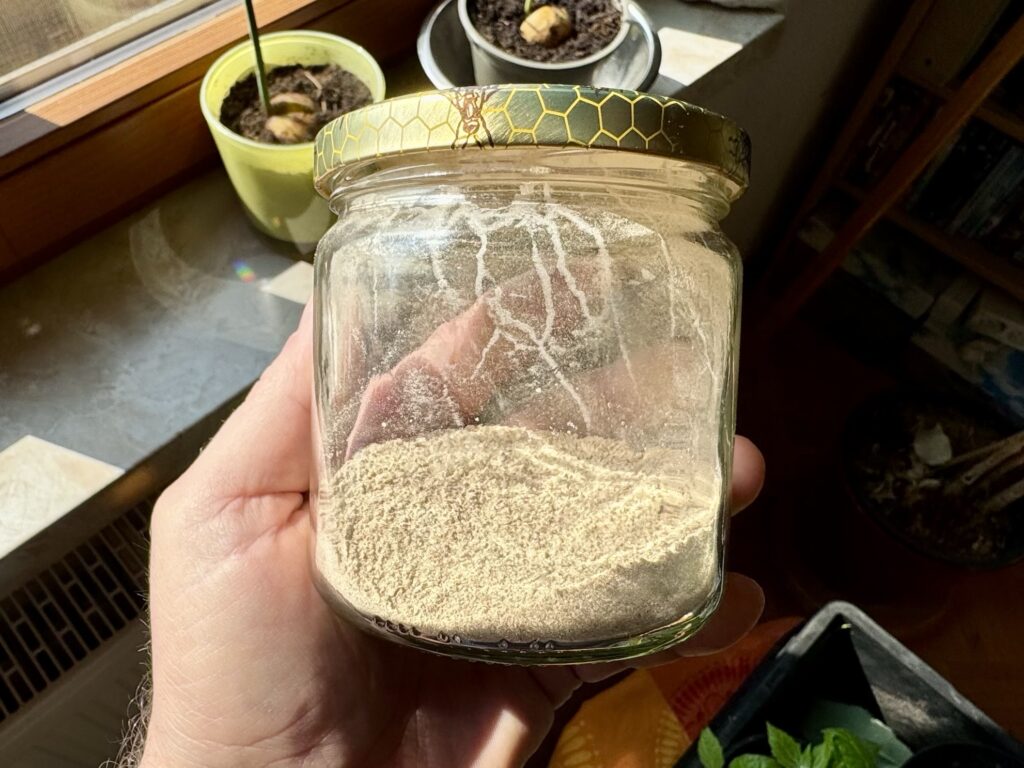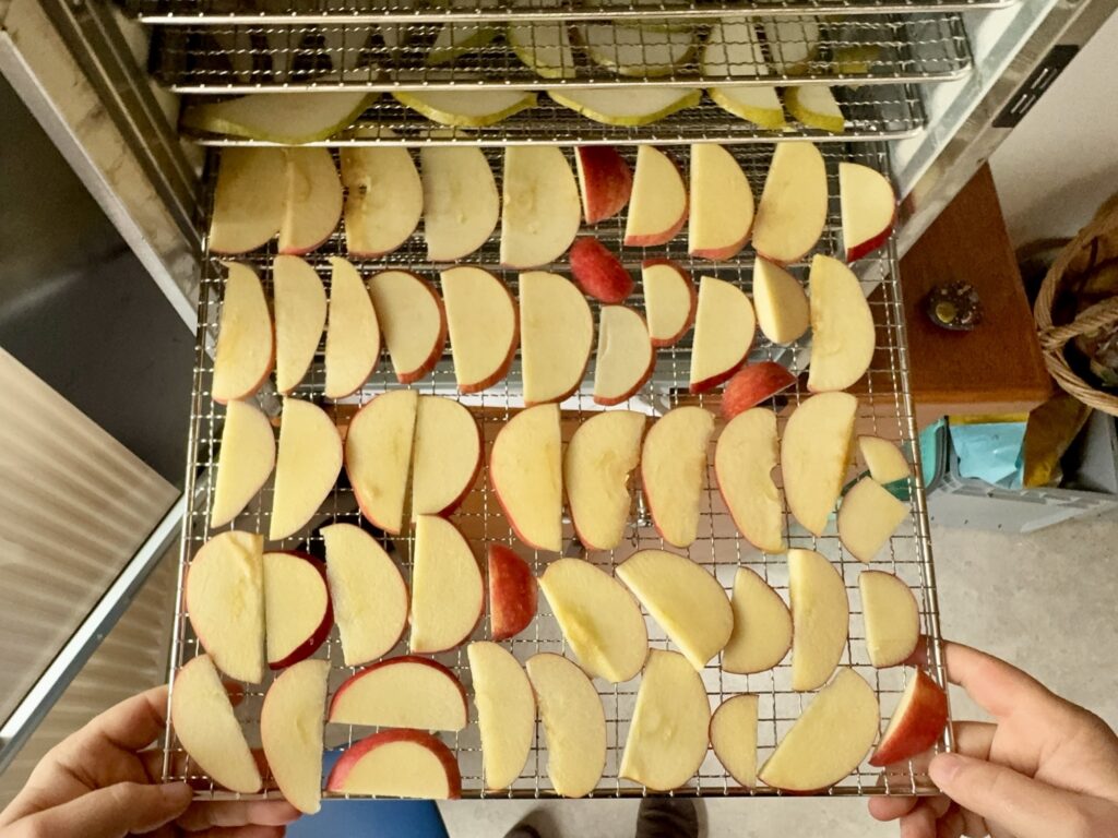 Diesen Puderzucker mische ich mit echtem Ceylon-Zimt*. Das ideale Mengenverhältnis für die Mischung ist bei mir 1 Teil Zimt auf 5 Teile Zucker. Dann kommt noch ein Teil echter Buorbon Vanillezucker* dazu – Das sorgt für ein intensives Aroma, ohne die Süße des Apfels zu erschlagen. Dann kommt noch eine Messerspitze Vitamin C Pulver* dazu – Das gibt noch ein bisschen mehr Säure und Vitamin. Die Apfelscheiben werden darin gewendet, nachdem sie aus dem Dörrgerät kommen. Da sonst der Zucker das Gitter und das Gerät komplett versauen. Das wollen wir natürlich nicht😅