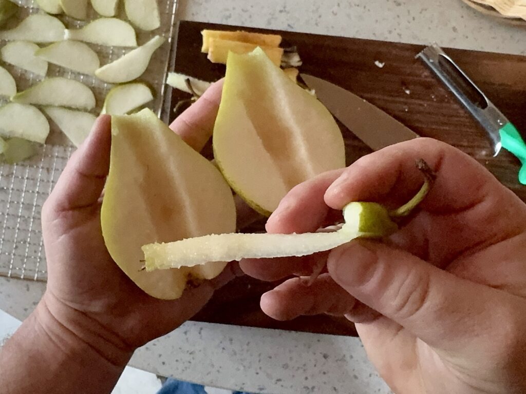 • Birnen: Da Birnen oft kleiner und schmaler sind, würde ein kompletter Durchstich zu viel vom guten Fruchtfleisch rauben. Ich halbiere sie erst und fahre dann nur mit der halben Rundung des Ausstechers durch die Mitte. So bleibt mehr von der Birne übrig. Auch sie schneide ich längs in Scheiben.